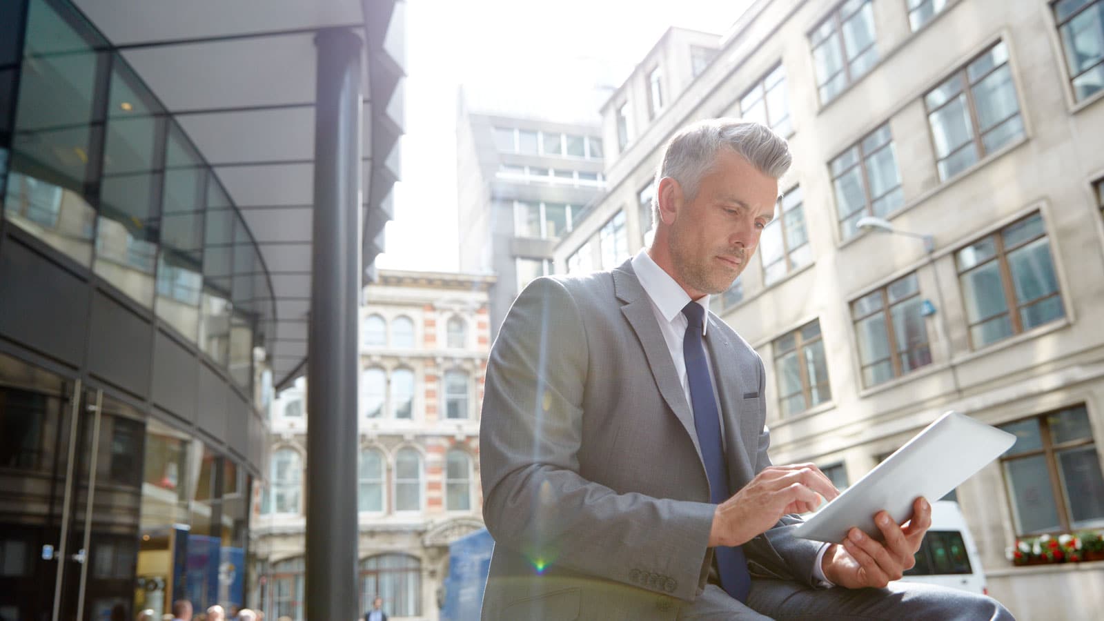 Mann in Stadt mit Tablet